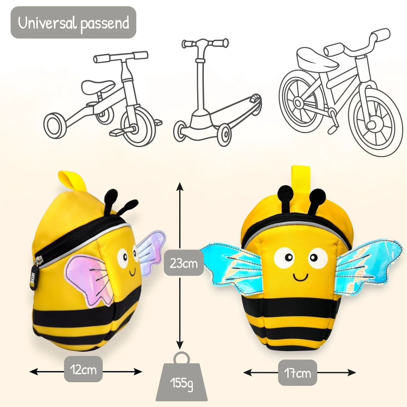 🐝 2-in-1 ontdekkersrugzak in bijenontwerp – rugzak & fietstas in één Deze multifunctionele tas kan razendsnel worden omgetoverd van een fietstas naar een comfortabele rugzak – ideaal voor kleine ontdekkers. Het liefdevol ontworpen bijenmotief met glanzende 3D-vleugels prikkelt de fantasie, terwijl reflecterende elementen zorgen voor extra veiligheid in het verkeer. Met slechts 155 g is hij bijzonder licht en comfortabel om te dragen.