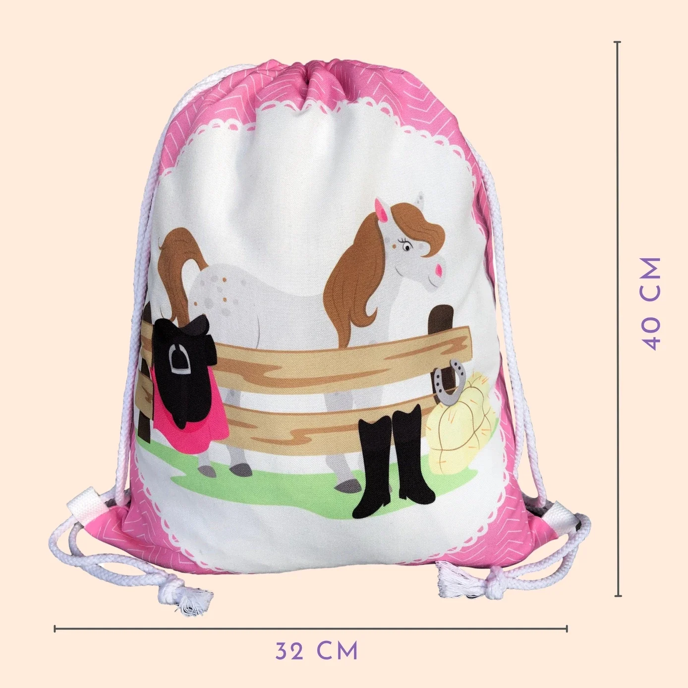Dubbelzijdige print in roze & wit – kleurrijk & kindvriendelijk. Afmetingen: ca. 40 × 32 cm – ideaal voor speelgoed, boeken, kleding of sportspullen. Materiaal: Stevige katoen-polyestermix met versterkte hoeken – stabiel & duurzaam. Trekkoordsluiting – gemakkelijk te openen & te sluiten, ook voor kleine handen. Koorden individueel in te korten – voor optimale pasvorm bij kinderen van elke leeftijd. Veelzijdig inzetbaar: kinderopvang, school, speeltuin, rijles, vakantie of bij sport.