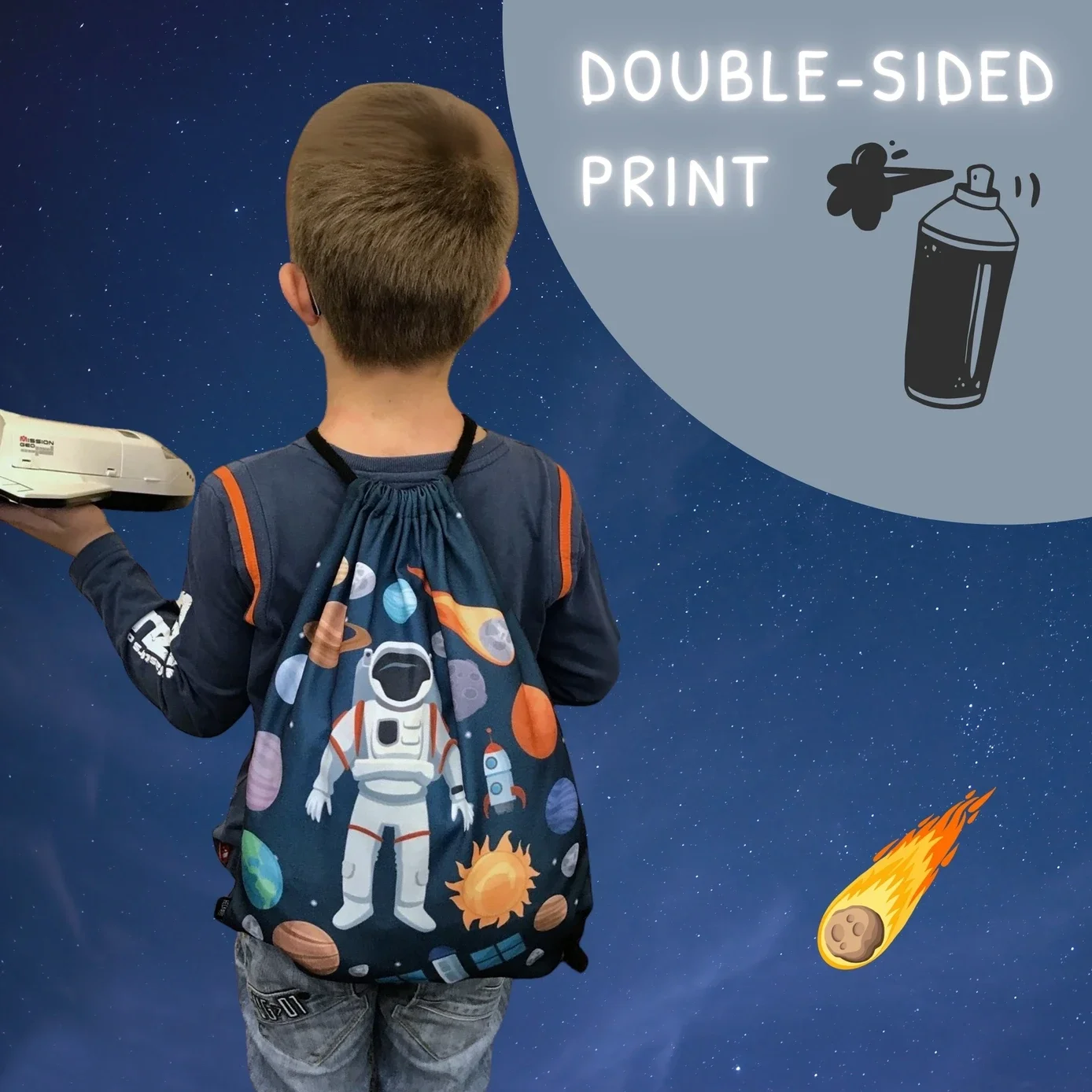🚀 gymtas in cool ruimteontwerp Een praktische metgezel voor kleine astronauten: Fascinerend motief met astronaut, raket, zon en planeten , dubbelzijdig bedrukt in levendige kleuren.