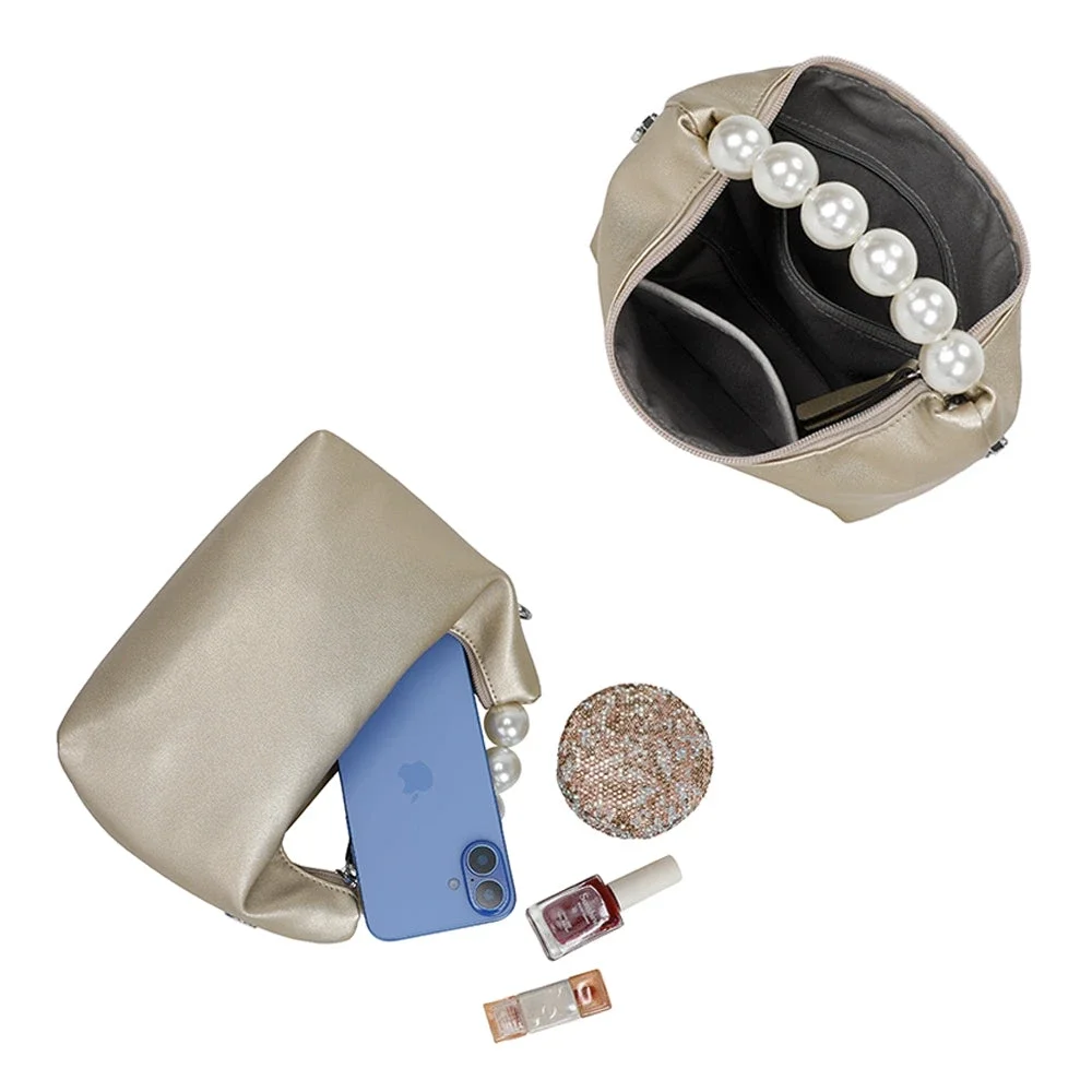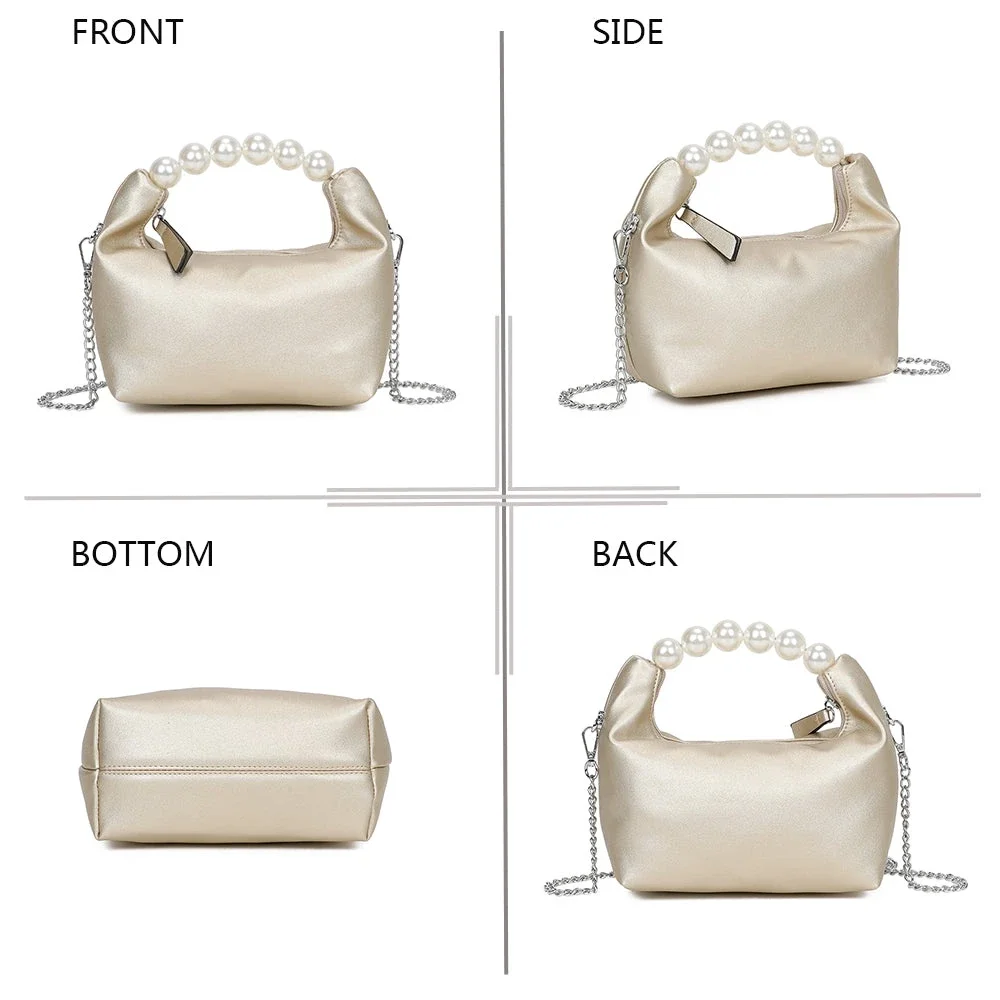 De "Lumière Perle" tas is een chique en verfijnd modeaccessoire, perfect om een vleugje glamour aan elke outfit toe te voegen. Met zijn met parels versierde handvatten biedt deze tas een vleugje luxe en verfijning. De afneembare ketting maakt het mogelijk om hem over de schouder of crossbody te dragen, waardoor hij veel flexibiliteit biedt om zich aan te passen aan al uw dagelijkse activiteiten.