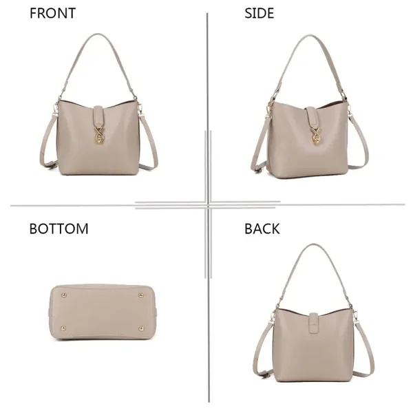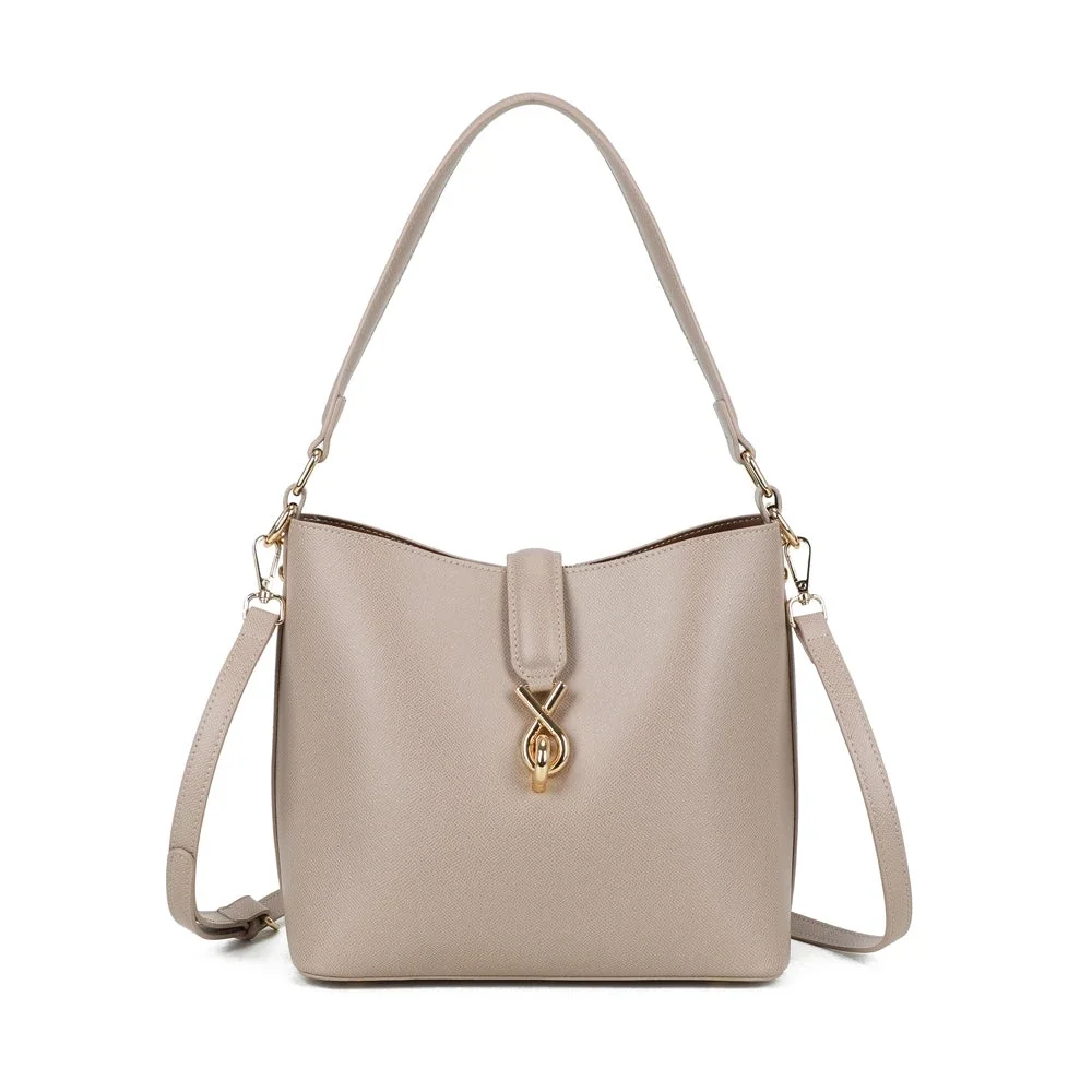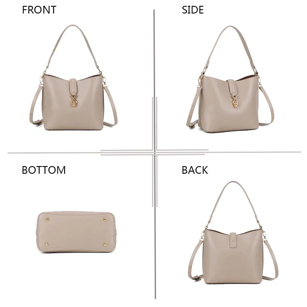 Calyra onderscheidt zich met een strak ontwerp dat verleidt met zijn moderne en verfijnde uitstraling. De gestructureerde vorm, gecombineerd met een gouden metalen sluiting in het midden, geeft het een stijl die zowel chic als tijdloos is. Gemakkelijk dagelijks te dragen, past het zowel bij een elegante outfit als bij een meer casual look. Dankzij de dubbele draagbaarheid kan het zowel over de schouder als crossbody worden gedragen, wat comfort en bewegingsvrijheid biedt gedurende de dag. Functioneel & goed georganiseerd interieur Het interieur van de tas is ontworpen voor praktisch en functioneel gebruik. Het ruime hoofdvak biedt gemakkelijk plaats aan uw dagelijkse benodigdheden: telefoon, portemonnee, notitieboekje of tablet. Een verzorgde voering zorgt voor een elegante afwerking en beschermt uw persoonlijke bezittingen effectief.